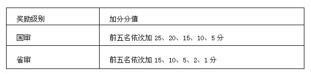在全国学科竞赛中获得奖励者,按照一、二、三等奖的梯度分别加10、8、5分;在省级学科竞赛中获得奖励者,按照一、二、三等奖的梯度分别加5、4、3分;在校级学科竞赛中获得奖励者,按照一、二、三等奖的梯度分别加3、2、1分(以证书为准)。